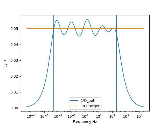This program use standard linear solids to model attenuation effects. The correction method (van Driel et al, 2014) make us only do one non-linear inversion to get coefficients that can be used for many Qs. The current coefficients in this program only be valid for 0.01-100 Hz (see figure below). If your application requires Q at different frequency domain, you can use scripts/attenuation.py to compute your coefficients, and paste to src/attenuation.cpp.
